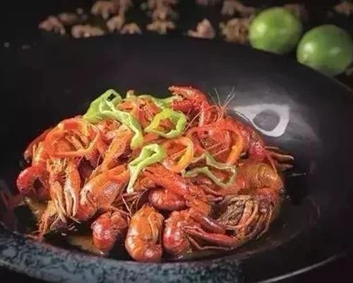 3、客人點(diǎn)菜時(shí),鍋內(nèi)放入色拉油50克,燒至五成熱時(shí),放入黑胡椒碎、黑胡椒粉、黑胡椒汁炒香,倒入小龍蝦600克翻炒均勻,注入黑椒鹵水150克大火燒開,小火燒2—3分鐘,出鍋裝入容器內(nèi),撒青、紅椒圈點(diǎn)綴。